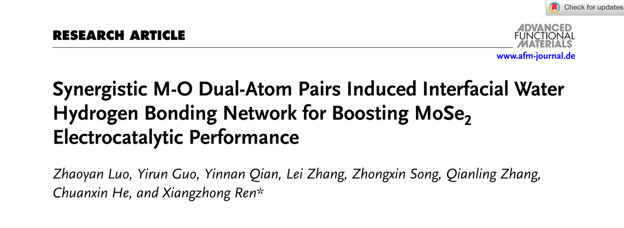 深圳大学化学与环境工程学院任祥忠教授团队在材料领域顶尖期刊《Advanced Functional Materials》(影响因子18.5,中科院JCR 1区,TOP期刊)发表了题为《Synergistic M-O Dual-Atom Pairs Induced Interfacial Water Hydrogen Bonding Network for Boosting MoSe2 Electrocatalytic Performance》的研究论文。该团队助理教授罗兆艳和硕士研究生生郭逸润为论文共同第一作者,深圳大学任祥忠教授为该论文通讯作者,深圳大学为唯一作者单位和唯一通讯单位。