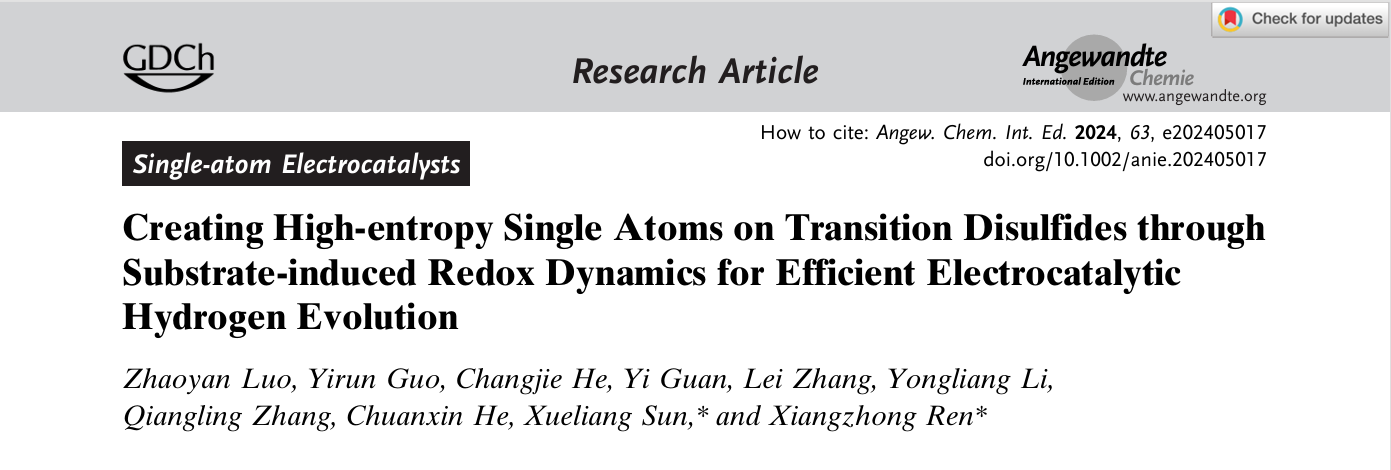 近日,深圳大学化学与环境工程学院任祥忠教授团队在化学领域顶尖期刊《Angewandte Chemie》(影响因子16.6,中科院JCR 1区,TOP期刊)发表了题为《Creating High-entropy Single Atoms on Transition Disulfides through Substrate-induced Redox Dynamics for Efficient Electrocatalytic Hydrogen Evolution》的研究论文。深圳大学罗兆艳助理教授为论文第一作者,深圳大学任祥忠教授和加拿大西安大略大学孙学良院士为该论文共同通讯作者,深圳大学为第一作者单位和第一通讯单位。