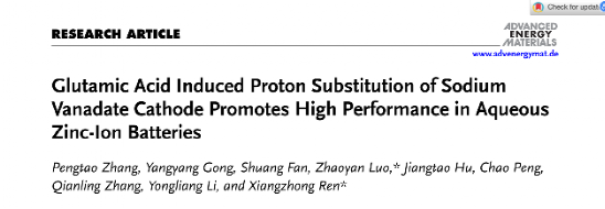 深圳大学化学与环境工程学院任祥忠教授团队在材料领域顶尖期刊《Advanced Energy Materials》(影响因子24.4,中科院JCR 1区,TOP期刊)发表了题为《Glutamic Acid Induced Proton Substitution of Sodium Vanadate Cathode Promotes High Performance in Aqueous Zinc-Ion Batteries》的研究论文。该团队硕士生张鹏涛为论文第一作者,深圳大学任祥忠教授和罗兆艳助理教授为该论文共同通讯作者,深圳大学为第一作者单位和第一通讯单位。
