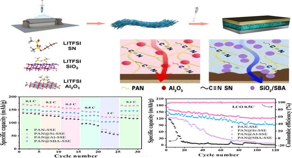 本研究中,为了开发具有卓越离子导电性和广泛电化学稳定性的电解质,制备了3D PAN纳米纤维和包含不同路易斯酸-碱属性的无机填料的聚合物电解质。PAN@Al-SSE展现出优异的离子导电性(室温下为0.48 mS·cm−2)、高Li+传输数(0.41)和宽电化学窗口(5.26 V)。该装置能在0.03 V下,0.2 mA·cm−2的电流密度下稳定运行超过1000小时。此外,该技术为高电压Li-LiCoO2固态电池提供了卓越的循环性能(在0.2和1 C下100次循环后分别保留91.3%和82.1%)。机制研究表明,表面填料的路易斯酸-碱属性对于形成稳定的固体-电解质界面层至关重要。特别是,具有更多路易斯酸位点的γ-Al2O3确保了LiTFSI的解离,并诱导了丁二腈的过度分解和聚合。在丁二腈基固态电解质中,解离和聚合之间的平衡效应对于改善丁二腈基固态锂电池的性能,尤其是在高电压条件下,起着关键作用。