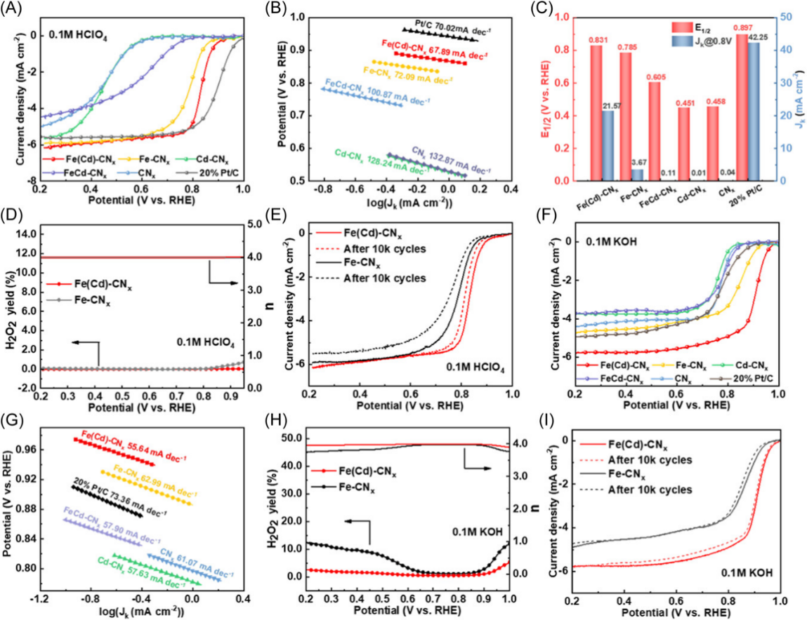 Fe(Cd)-CNx催化剂在酸性和碱性溶液中的电化学ORR性能
