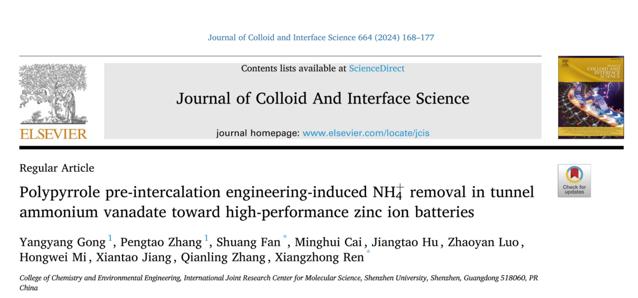 深圳大学化学与环境工程学院任祥忠教授团队在材料领域顶尖期刊《Journal of Colloid And Interface Science》(影响因子9.1,中科院JCR 1区,TOP期刊)发表了题为《Polypyrrole pre-intercalation engineering-induced NH4+ removal in tunnel ammonium vanadate toward high-performance zinc ion batteries》的研究论文。该团队硕士生龚洋洋和张鹏涛为本文的共同第一作者,深圳大学任祥忠教授和范爽专职研究员为该论文共同通讯作者,深圳大学为第一作者单位和第一通讯单位。