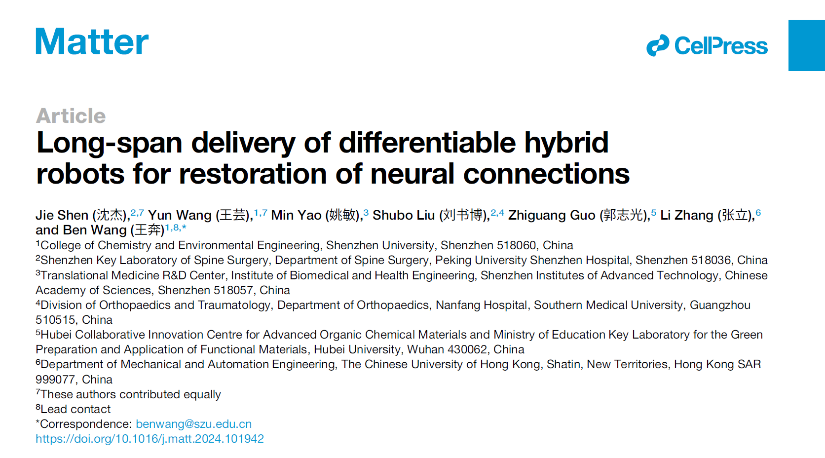 近日,深圳大学化学与环境工程学院王奔老师在医用软体机器人领域取得重要研究进展,其研究成果以题为“Long-span delivery of differentiable hybrid robots for restoration of neural connections”发表在国际顶级期刊《Matter》上。文章提出了一种基于干细胞自组装的仿生软体微型机器人,实现了在复杂脊液环境中靶向递送干细胞并促进神经连接修复,为神经损伤的微创治疗提供了全新方案。深圳大学为该论文第一完成单位,王奔老师为通讯作者,深圳大学2020级硕士研究生王芸为共同第一作者。