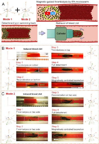 图1. 两种磁驱动模态下的快速血栓脱壁剥离与碎块磁化。