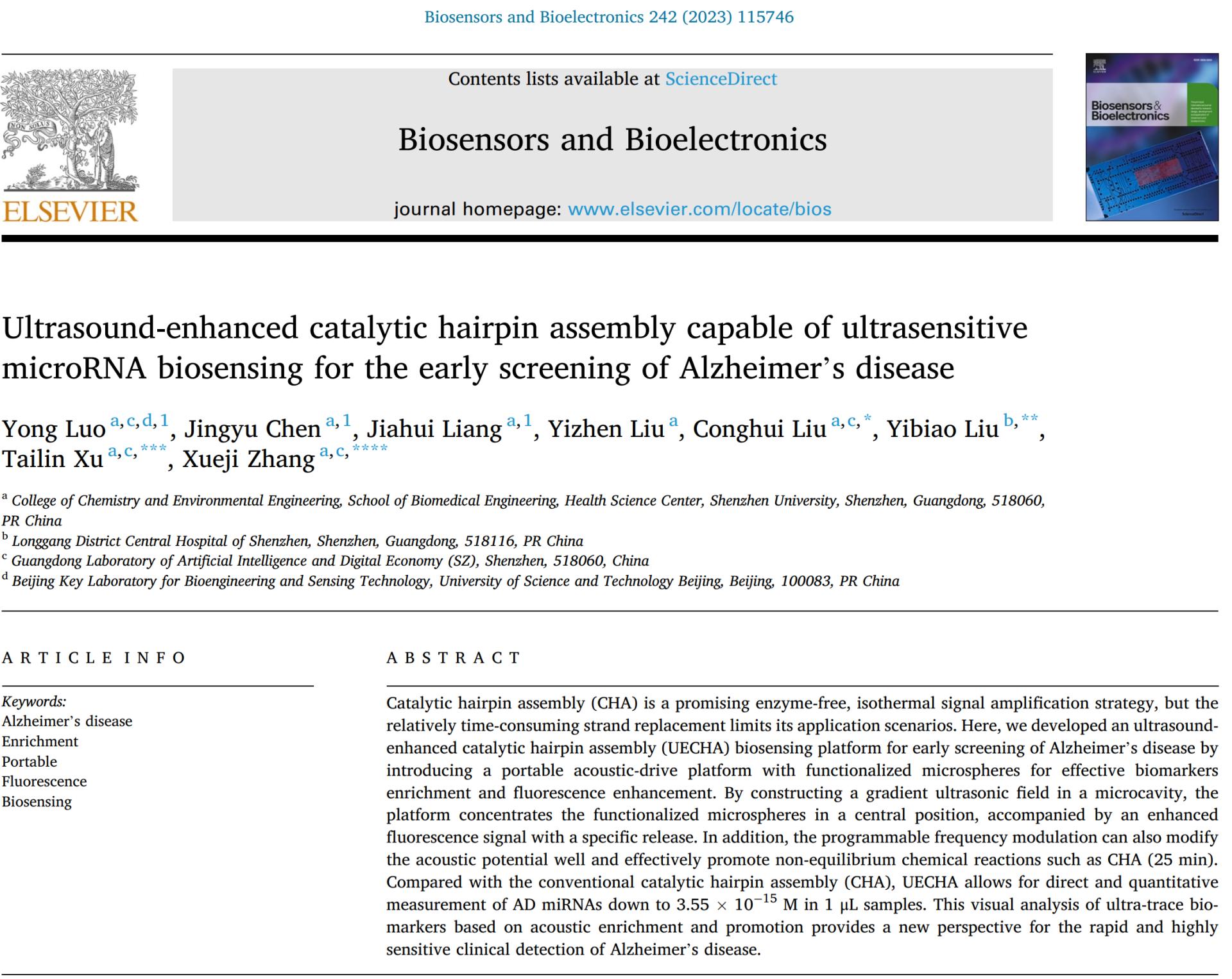 3. 深大-北科大联培博士生罗勇与我院21级化学专业本科生梁嘉慧、陈婧妤一起,以共同第一作者身份在在中科院一区TOP期刊Biosensors and Bioelectronics上发表题为“Ultrasound-enhanced catalytic hairpin assembly capable of ultrasensitive microRNA biosensing for the early screening of Alzheimer’s disease”的研究论文。该研究得到了广东大学生科技创新培育专项资金支持,获得了深圳大学大学生创新创业训练计划项目(省级)优秀结题、深圳大学2023“荔园挑战”创新创业大赛学术赛道一等奖以及深圳大学2025届百篇优秀本科毕业论文(设计)。21级化学专业本科生梁嘉慧、陈婧妤均获得院荣誉学士学位,并分别获得深圳大学、西湖大学的直博资格。