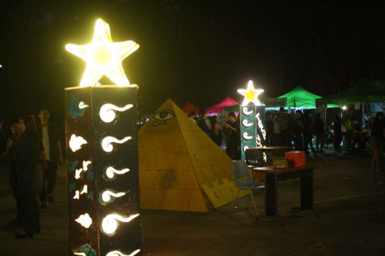 这次“科技文化节”中举办的“科技狂想夜”目的是为了更好地向全校师生宣传科技文化,让全校师生开阔视野,对科技有更进一步,更深刻的认识与了解。石头坞布置也十分用心,其中最显眼的莫过于石头坞中心的五星芒阵,以电子、化院、光电、生科以及机电各占一个五芒星灯塔,包围着法老的金字塔。