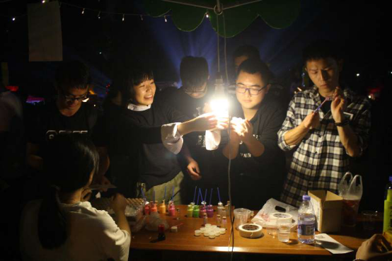 除了表演吸引人,同样吸引人的便是各个院的摊位游戏了,因为都是平时不容易接触的内容,所以大家对摊位游戏十分感兴趣,例如化学与环境工程学院的“夜光许愿瓶”,不仅仅触动了女生们心中的少女心,更让许多男生前来制作与观赏。当然其他摊位也同样精彩,同样吸引了很多人。