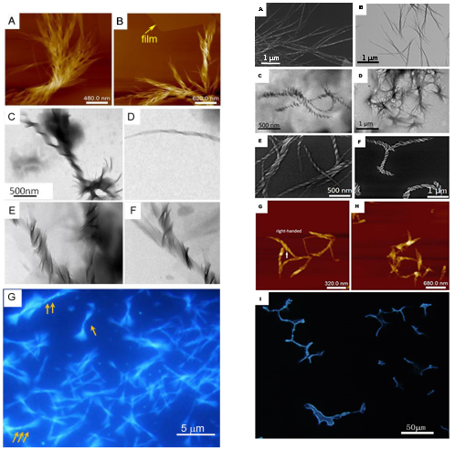 (右)缬氨酸双取代的四苯乙烯分子形成的不同超螺旋带、纤维。