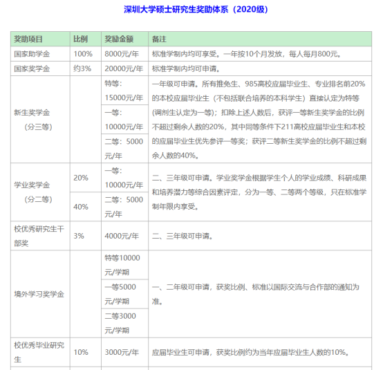 具体资助说明可见“深圳大学硕士研究生奖助体系(2020级,仅供参考,具体以2021级奖助体系为准)”https://yz.szu.edu.cn/info/1041/11102.htm。