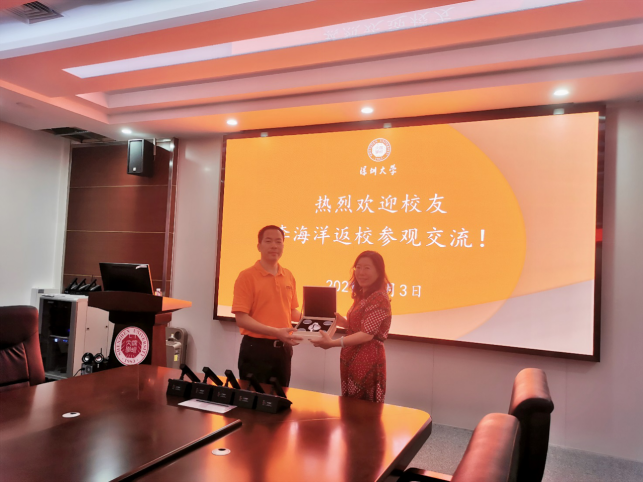 首先,李翠华书记代表学院对李海洋先生的归来表示热烈欢迎,赠送了深圳大学纪念品,并介绍了学院校友工作的进展情况,主要包括信息整理、奖学金设立、资源利用、实习实践合作等方面。