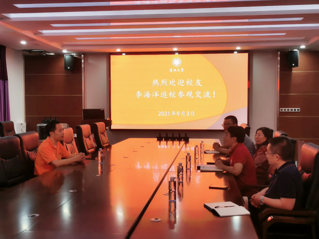 李海洋先生在听取介绍后,对化学与环境工程学院的校友工作及学院发展提出了许多宝贵意见,并就设立校友奖学金、实习实践合作等进行了细致深入地探讨。