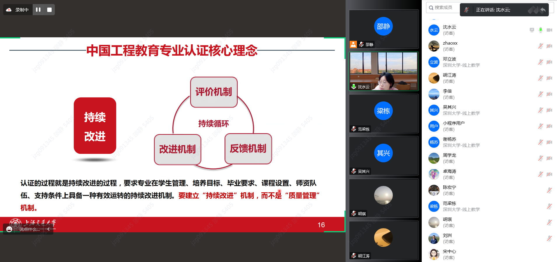会上,沈水云教授分享了上海交通大学获得能动工程专业首批工程教育专业认证的成功经验,从工程教育专业认证的核心理念出发,具体介绍了培养目标、毕业要求、课程目标的关系构建以及OBE评价、改进、反馈机制的实施,系统介绍了能动专业认证工作的整体流程、各个环节的关键点及注意事项。讲座后,沈教授与能源系参会老师就评审要点、毕业设计、评价机制等内容进行了深入的讨论和交流,对新能源专业的认证工作提出了宝贵建议。本次交流会为新能源专业的工程教育认证工作提供了直接经验,也为即将开展的相关申报工作提供了最新信息,促进了新能源专业认证后续工作的顺利开展。