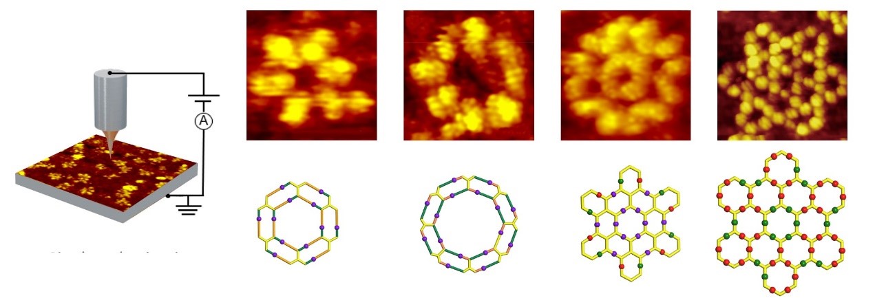 分子束外延技术为至下而上生长零维大环、一维和二维分子结构提供了新的途径。通过Ullmann和Glaser等偶联反应以及配位反应,在金属单晶表面上合成可控的原子级精确的新颖结构,同时通过引入其他弱相互作用力的模板作用对产物合成进行精准调控。精准结构加上多样的官能团引入,为进一步探索新颖的结构和功能奠定基础。