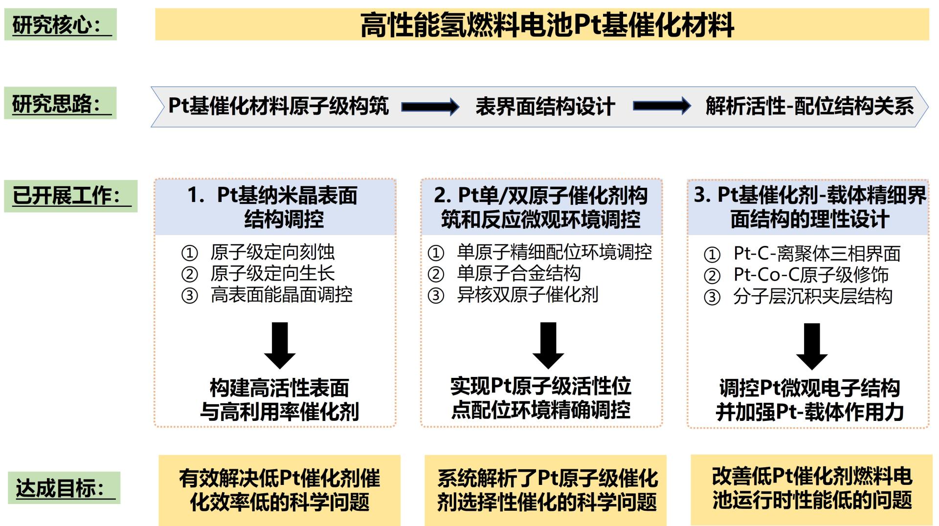 精准调控Pt基纳米催化剂表界面结构,大幅提升了低Pt催化剂的催化效率;精细设计单原子级催化剂配位环境,系统解析了Pt原子级催化剂的选择性催化问题;理性构筑Pt催化剂-载体界面结构,显著提高了低Pt催化剂在燃料电池运行时的电催化性能;从原子尺度上加深了对燃料电池催化剂表面原子排布和催化系统配位环境与催化性能的构效关系理解,为高效燃料电池催化剂的理性设计提供了理论指导和技术支持。