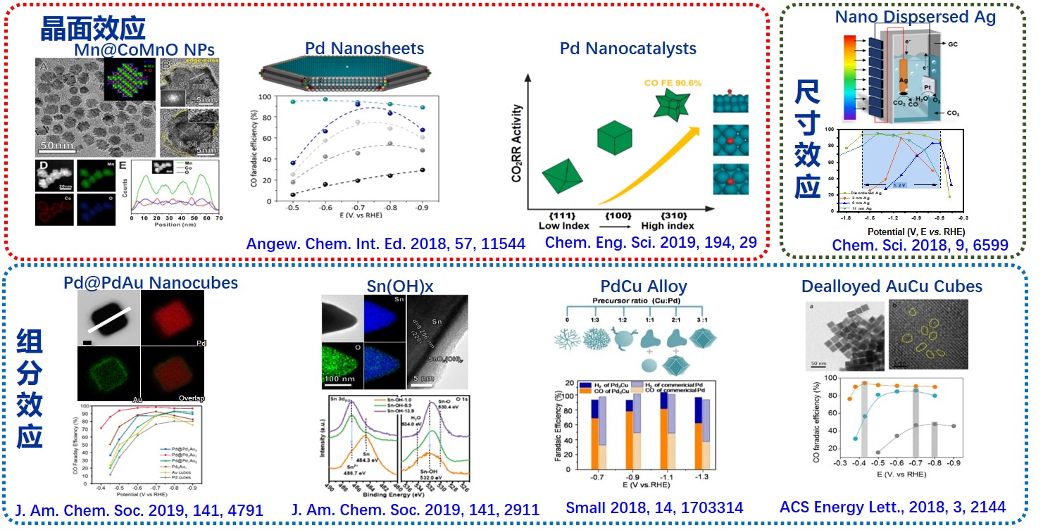 面向设计单原子催化剂、相邻双原子单体催化剂以及多原子催化剂,利用多单原子协同作用,改善催化材料电催化CO2还原性能;通过精准调控原子沉积位点,开发一系列表面配位数可控的无机纳米材料,通过将表面配位环境与组分效应、尺寸效应耦合,探索影响材料催化性能的关键要素,实现催化剂催化性能的提高。团队目前已经开发了一系列包括单原子催化剂、表界面可控的纳米催化剂用于CO2催化转化,通过对催化材料的原子尺度设计,能够优化CO2还原过程电流密度、法拉第效率以及稳定性等关键性能。尝试利用原位分析手段,结合反应动力学解析,明确不同电子转移反应下,二氧化碳电化学还原反应的关键中间体及控速步骤,为CO2还原的工业化应用提供理论指导与依据。